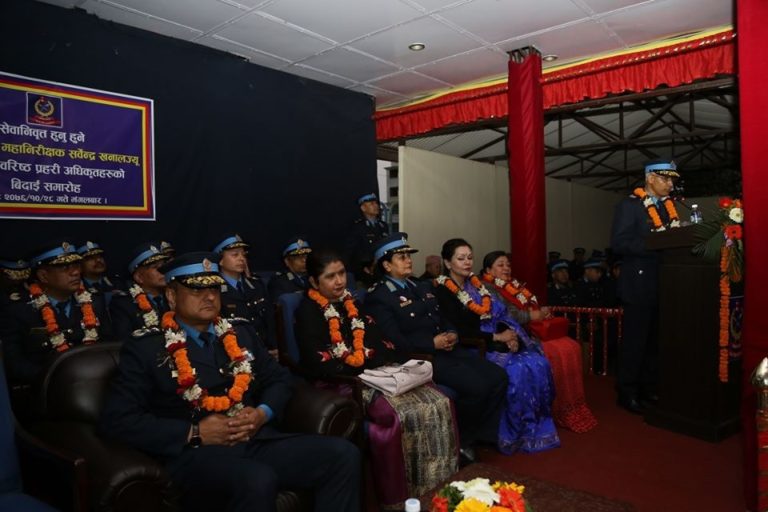 , प्रहरी अतिरिक्त महानिरीक्षकहरु तथा प्रहरी नायव महानिरीक्षकहरुलाई मंगलबार प्रहरी प्रधान कार्यालयमा आयोजित बिशेष समारोहबीच बिदाइ गरिएको छ । उनीहरुलाई नवनियुक्त प्रहरी महानिरीक्षक ठाकुर प्रसाद ज्ञवालीले फूलमाला लगाई हार्दिक बिदाइ गरेका हुन्।उक्त अवसरमा प्रहरी अतिरिक्त महानिरीक्षक डा।आशा सिंह, प्रहरी नायव महानिरीक्षकहरु, वरिष्ठ प्रहरी अधिकृतहरु, प्रहरी अधिकृत तथा जवानहरुले सबैलाई बिदाइ गरेका थिए ।-Photo Source: Nepal Police
