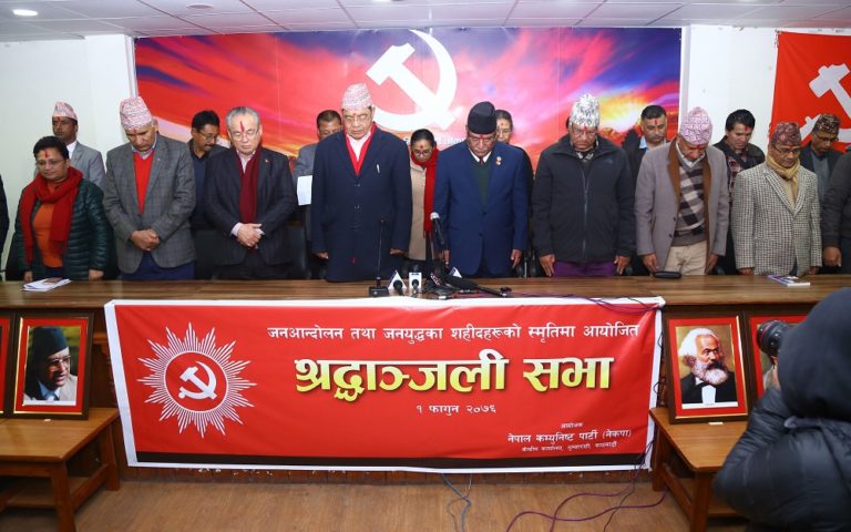 काठमाडौँ, १ फागुन : नेपाल कम्युनिष्ट पार्टी (नेकपा)द्धारा धुुम्रबराहीस्थित पार्टी कार्यालयमा विहिवार आयोजित जनआन्दोलन तथा जनयुद्धका शहीदको श्रद्धाञ्जलिसभामा मौनधारण गर्दै अध्यक्ष पुुष्पकमल दाहाल ‘प्रचण्ड’लगायत नेताहरु ।