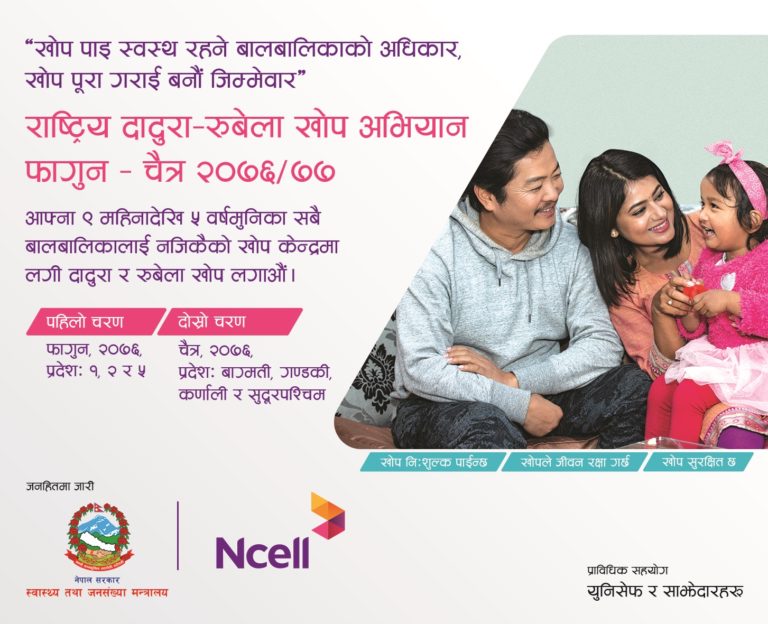 काठमाडौं, फागुन २ । एनसेल प्राइभेटले स्वास्थ्य तथा जनसंख्या मन्त्रालय र युनिसेफसँग सहकार्य गर्दै सरकारको राष्ट्रिय दादुरा–रुबेला अभियान २०७६÷७७ मा सघाउने भएको छ । यस बहुप्रतिक्षित खोप अभियान अन्तर्गत सरकारले ९ महिनादेखि ५ वर्ष सम्मका करिब ३० लाख बालबालिकालाई दादुरा रुबेला खोप लगाउने लक्ष्य राखेको छ ।