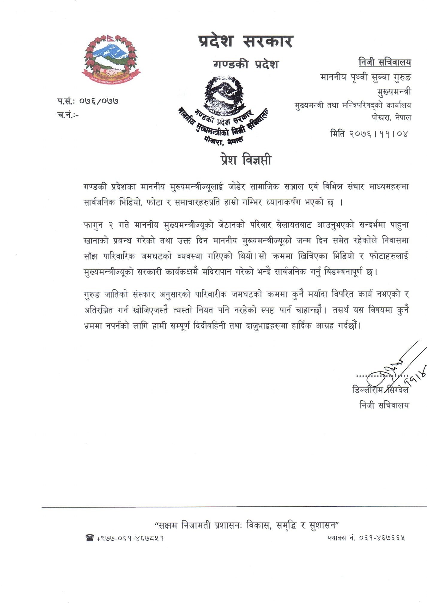 गण्डकी प्रदेशको मुख्यमन्त्रीको निजी सचिवालयबाट जारी प्रेस विज्ञप्तिमा भनिएको छ, ‘गुरुङ जातिको संस्कार अनुसारको पारिवारिक जमघटको क्रममा कुनै मर्यादा विपरित कार्य नभएको र अतिरञ्जित गर्न खोजिएजस्तै त्यस्तो नियत पनि नरहेको स्पष्ट पार्न चाहन्छौं ।’