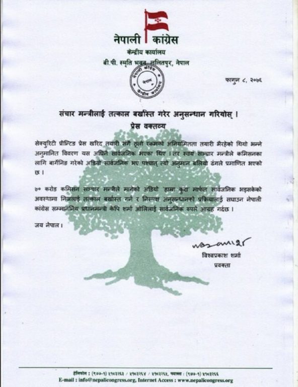 काँग्रेसले सेक्युरिटी प्रिन्टिङ प्रेस खरिदमा कमिशनको खेल भएको प्रमाणित भइसकेको बताएको छ ।