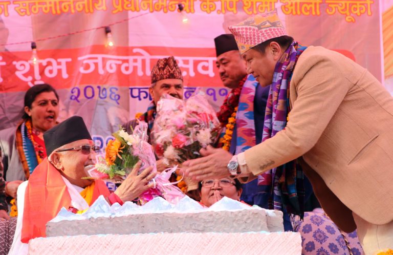 बुबा मोहनप्रसाद ओली र धर्मपत्नी राधिका शाक्यका साथ आएका ओलीले आप्mनो जन्मघरको सिकुवाको डिलमा बसेर तस्बीर खिचाए। बाल्यकालका केही दौँतरीसँग पनि उनले भलाकुसारी गर्न भ्याए। ओलीले जन्मदिनको अवसरमा घरको आँगनमा केक काटेर बुबा मोहनप्रसाद र धर्मपत्नी राधिका शाक्यलाई खुवाए । पत्नी राधिका शाक्यले पनि ओलीलाई केक काटेर खुवाईन् । प्रधानमन्त्री ओलीले सङ्क्रान्ति बजारमा पुनःस्थापना गरिएको नेपाल बैंकको १७७औँ शाखाको पनि आज नै उद्घाटन गरे । रासस