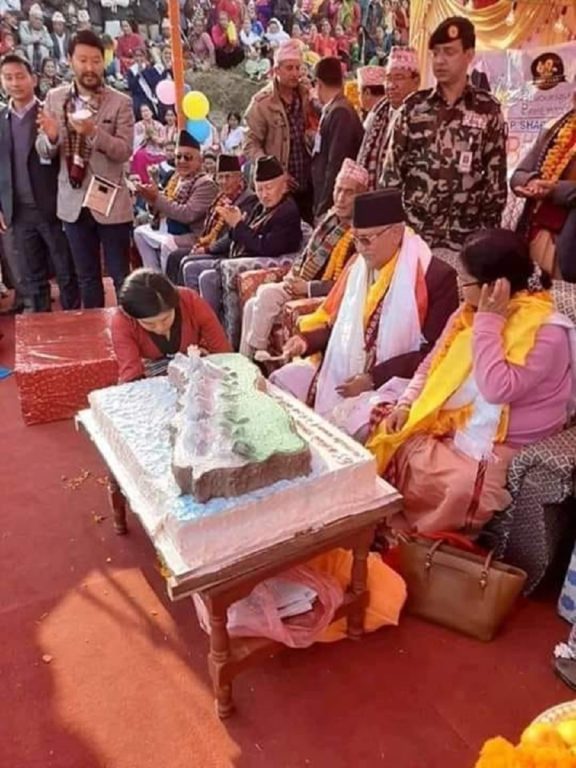 केक नेपालको नक्शा आकारको थियो । प्रधानमन्त्री ओलीले श्रीमती राधिका शाक्यको साथ बसेर केक काटे । नेपालको नक्शा आकारको केक काटेको भन्दै सामाजिक सञ्जालमा प्रधानमन्त्रीको चर्को आलोचना भएको छ । कतिपयले देशको नक्शा आकारको केक काटेर मानमर्दन गरेको तर्क गरेका छन् ।