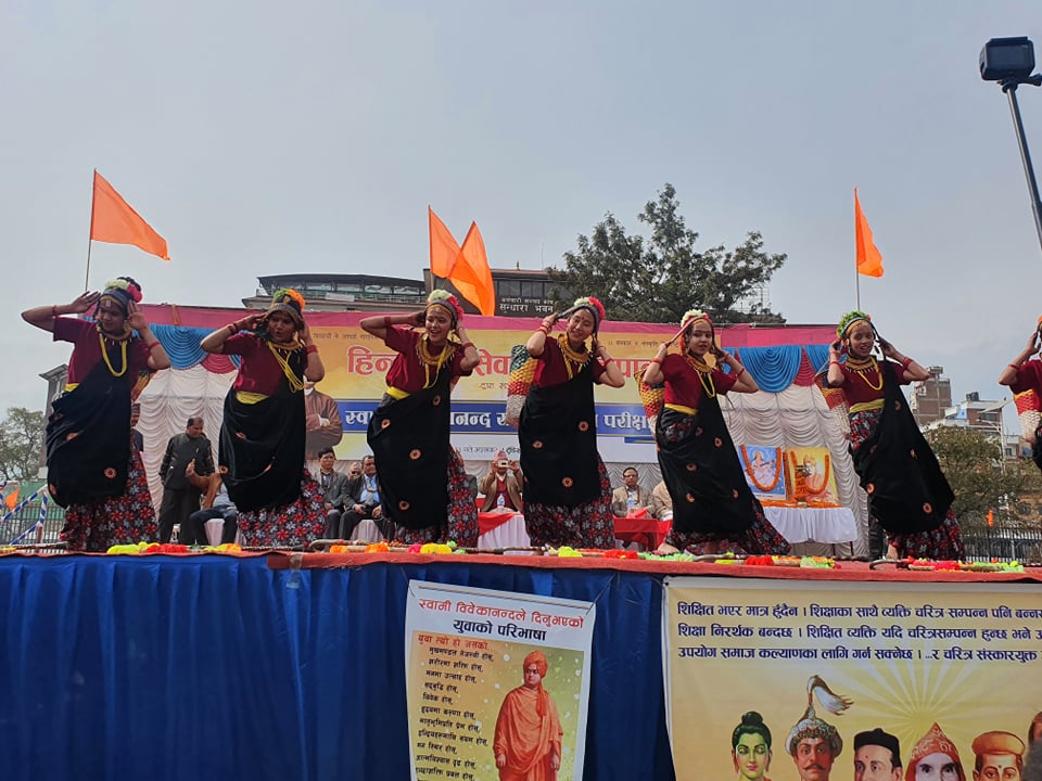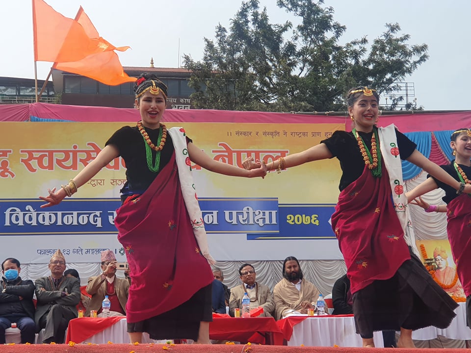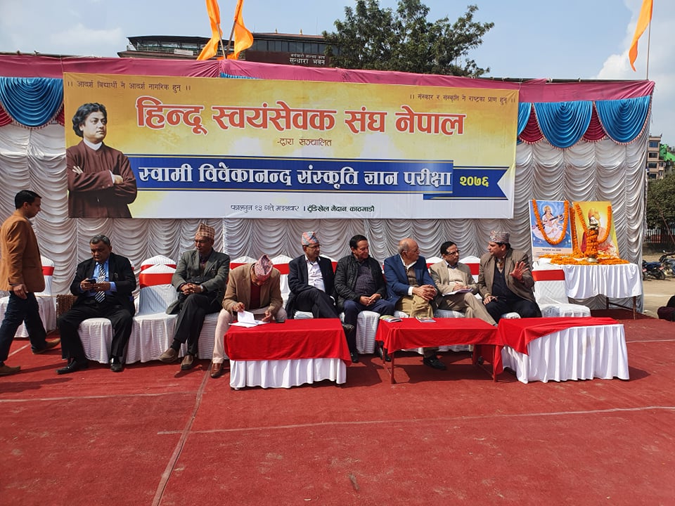 कार्यक्रमका प्रमुख अतिथि डा. जयराज आचार्यले नेपाललाई पुरानो जगमा नयाँपन दिने कार्य अब नयाँ पुस्ताको काँधमा आएको बताए। कार्यक्रममा संघका राष्ट्रिय सह–संघचालक कल्याण कुमार तिम्सिनाले हिन्दू स्वयंसेवक संघ नेपालको गतिविधिहरूबारे जानकारी दिए । संस्कार, सेवा र संगठनलाई आफ्नो कार्यको माध्यम बनाएर समाजमा सकारात्मक जागरणका लागि संघले कार्य गरिरहेको बताए। यसै क्रममा आफ्नो धर्म–संस्कृति, रीति, परम्परा, वैज्ञानिक पुर्खा, ज्ञानी महापुरुष, आदर्श नारी आदिबारे बोध गराउने उद्देश्यले स्वामी विवेकानन्द संस्कृति ज्ञान परीक्षा आयोजना गरिएको बताए । कार्यक्रममा सहभागी विद्यालयका तर्फबाट विविधतामा एकता दर्शाउने सांस्कृति नृत्यहरूको प्रस्तुति पनि रहेको थियो ।