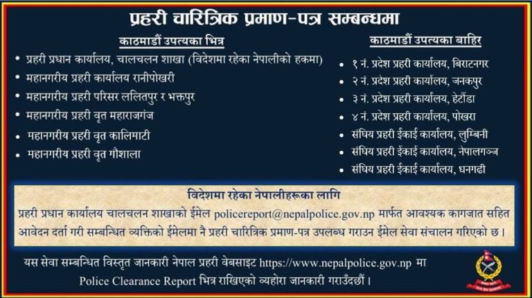 प्रहरीको वेभसाइटबाट फर्म डाउनलोड गरी सम्पूर्ण विवरण भरेर इमेल गर्दा दुई दिनमै प्रमाण पत्र उपलब्ध हुने गरेको छ । अति जरुरी भएकालाई एकै दिनमा उपलब्ध गराउने व्यवस्था गरिएको प्रहरी प्रधान कार्यालय चालचलन शाखाले जनाएको छ । बुधबार बिहान घरमै बसेर अनलाइन फर्म भरेर प्रमाणपत्र लिन बिहीबार प्रधान कार्यालय नक्साल पुगेका कीर्तिपुर मच्छेगाउँका राजेन्द्र शर्मा अनलाइन छिटोछरितो भए पनि इन्टरनेट र कम्प्युटरको सहज पहुँच नभएकाका लागि गाह्रो हुने बताए । (गोरखापत्र दैनिकबाट)