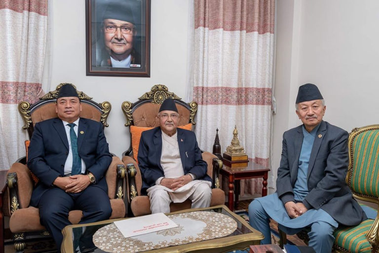 काठमाडौं, १९ फागुन । उपराष्ट्रपति नन्दबहादुर पुनले प्रधानमन्त्री केपी शर्मा ओलीलाई भेटेका छन् । मिर्गौलाको पूनः प्रत्यारोपणको लागि आजै अस्पताल भर्ना हुन लागेका प्रधानमन्त्री ओलीलाई भेटेर उपराष्ट्रपति पुनले स्वास्थ्यलाभको कामना गरेका थिए । Photo By: Surya Thapa/Press Advisor of Prime Minister KP Sharma Oli