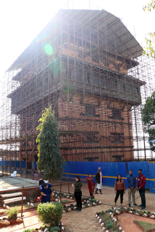 निर्माणाधीन नुवाकोटको साततले दरबार । विसं २०७२ वैशाख १२ को भूकम्पले क्षति पुगेको यस दरबार चीन सरकारको सहयोगमा पुनःनिर्माण शुरु गरिए पनि निर्माणको जिम्मेवारी पाएको ‘चाइनिज एकेडेमी अफ कल्चरल हेरिटेज’ काममा नफर्कंदा पुनःनिर्माण प्रभावित भएको छ । राष्ट्र निर्माता पृथ्वीनारायण शाहले विसं १९१९ मा निर्माण गरेको सो दरबारबाटै राजकाज चलाएका थिए ।