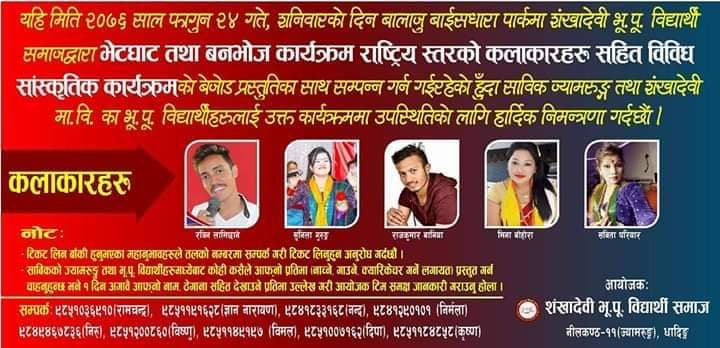 उक्त भुतपुर्व बिधार्थी समाज आयोजक रहेको बृहत कार्यक्रममा चर्तित लोकदोहोरी गायक रबिन लामिछाने, गायिका सबिता परियार, गायक राजकुमार बाँनिया, गायिका मिना बोहोरालगायत अन्य स्थानीय लोक गायक तथा गायिकाको समेत उपस्थिति रहने समाजले जनाएको छ । उक्त कार्यक्रममा सहभागी हुन रु ९०० को टिकट काट्नुपर्नेछ भने बाँकी रकम भुतपुर्व बिधार्थीबाट बिधालयलाई हस्तान्तरण गरिने आयोजकले जानकारी दिएको छ।
