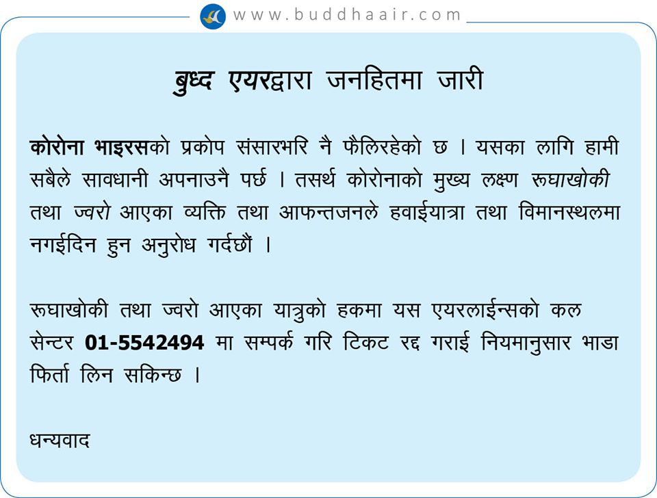 कम्पनीले सूचना जारी गरेर यस्तो लक्षण देखिएमा टेलिफोनमार्फत् टिकट रद्द गरेर नियमानुसार भाडा फिर्ता लग्न अनुरोध गरेको छ।