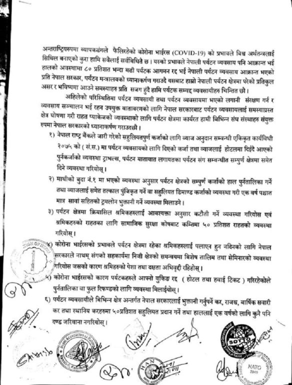 ६. पर्यटन व्यवसायीले विभिन्न क्षेत्रअन्तर्गत नेपाल सरकारलाई भुक्तानी गर्नुपर्ने कर, राजश्व, वार्षिक सवारी कर तथा स्थानीय करहरुमा ५०प्रतिशत सहुलियत प्रदान गर्ने तथा हाललाई एक वर्षको लागि कुनै पनि दण्ड जरिवाना नगरियोस्।