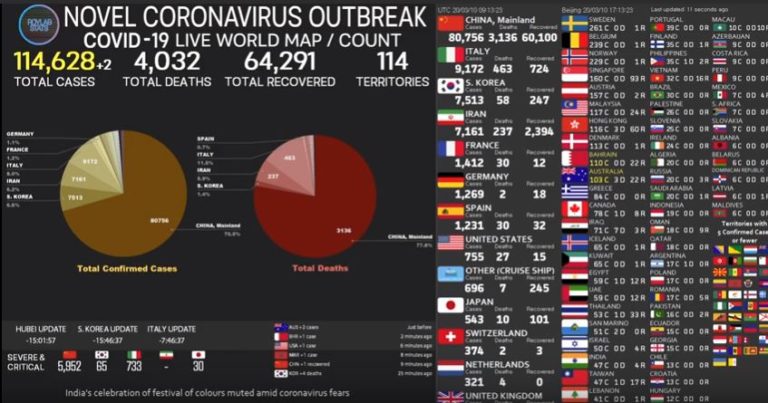 पछिल्लो विवरणअनुसार कोरोना भाइरस अर्थात कोभिड नाइन्टिनका कारण मृतकको संख्या ४ हजार २८ पुगेको छ । भाइरसबाट एक लाख १४ हजार पाँच सय २८ जना संक्रमित छन् । संक्रमितमध्ये ५ हजार सात सय जनाको अवस्था गम्भीर छ । करिब ६५ हजार संक्रमित भने निको भएर घर फर्किएका छन् । त्यसैगरी करिब ४१ हजारको अवस्था भने सामान्य रहेको छ ।