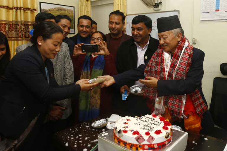 उक्त अवसरमा नेकपाका नेता खिमलाल भट्टराई लगायतका नेताहरुको उपस्थिति रहेको थियो । नेम्वाङको जन्मदिनमा उनका आफन्तजन तथा पार्टीका नेता तथा कार्यकर्ताहरुले शुभकामना दिईरहेका छन् । तस्विर : रासस