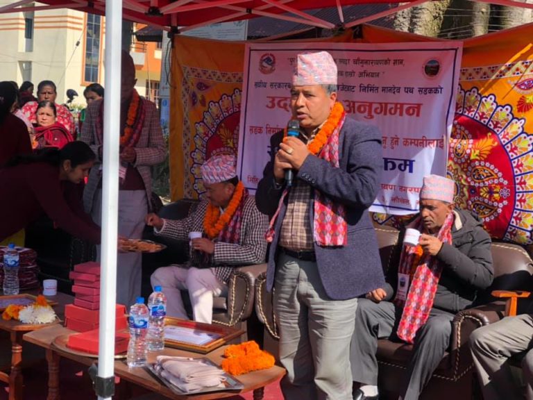 उनले सरकारले अघि बढाउने हरेक विकास आयोजना कार्यान्वयन गर्न आफूहरु सक्रिय रुपमा फिल्डमा खटिने पनि विश्वास दिलाए । उनले भने, हामी आयोजना कार्यान्वनयको लागि मैदानमा खटिन्छौं । उनले वर्तमान भौतिक पूर्वाधार तथा यातायात मन्त्री बसन्त नेम्वाङ जनताको आशा र भरोसाको केन्द्रको रुपमा स्थापित हुँदै गएको उल्लेख गर्दै मन्त्री नेम्वाङको नेतृत्वले १०० दिनमा गरेको विकासका कामले ऐतिहासिक सफलता हासिल गर्न सफल भएको समेत बताए । तस्विर : थापा दिनेशको फेशबुकबाट साभार