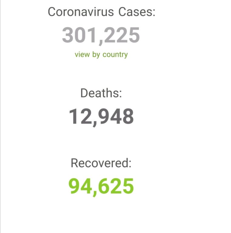 चैत ८, काठमाढ्डौ । कोरोना भाइरसले विश्वभर ३ लाख  २ हजार व्यक्ति संक्रमण गरेको छ । अहिलेसम्म १२ हजार ९ सय ४८ जनाको ज्यान लिएको छ ।