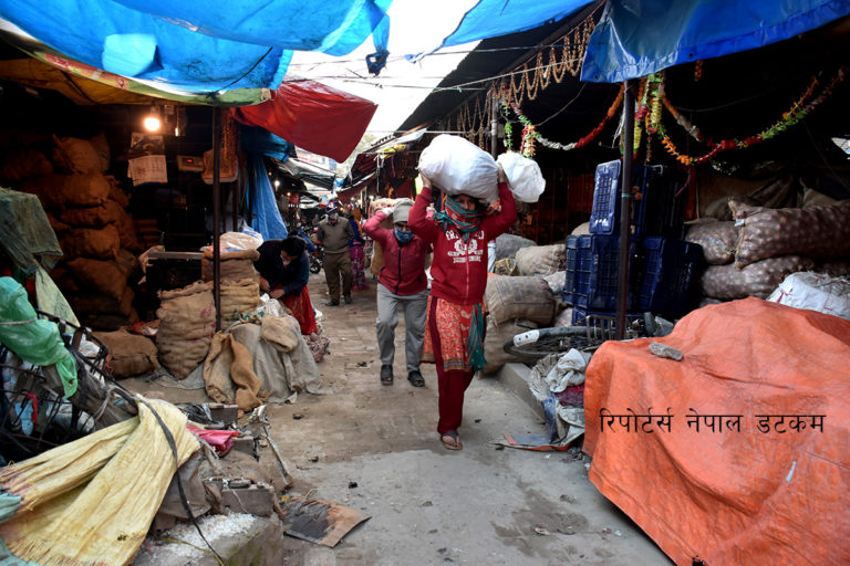 आज लकडाउनको दोस्रो दिन विहान ४ बजेबाट नै खाद्यान्न तथा तरकारी र फलफूलका पसलहरु खुलेका थिए । उपभोक्ताहरु पनि बिहानै आफूलाई चाहिने सामाग्रीको जोहो गर्न निस्किएका थिए । तस्विर : मुकुन्द कालिकोटे, रिपोर्टर्स नेपाल डटकम