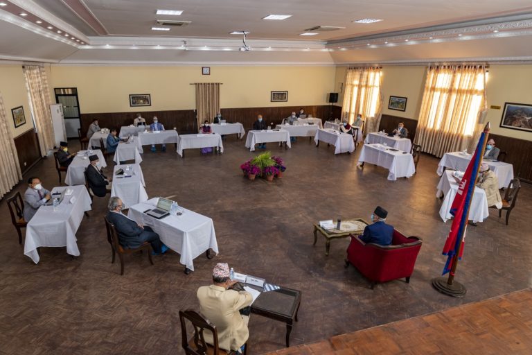 काठमाडौ, १६ चैत्र । मन्त्रिपरिषदको बैठकमा सामाजिक दूरी कायम गरिएको छ । प्रधानमन्त्री केपी शर्मा ओली र मन्त्रीहरु एक-अर्काबाट निकै टाढा बसे ।
