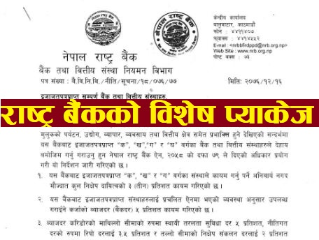 कोरोना भाइरस (कोभिड–१९) को संक्रमणसँगै अर्थतन्त्रमा ठूलो क्षति पुगेको भन्दै नेपाल राष्ट्र बैंकले सहुलियत घोषणा गरेको हो । महामारीका कारण उत्पन्न असहज परिस्थितिबाट प्रभावित पर्यटन, उद्योग, व्यवसाय तथा वित्तीय क्षेत्रका लागि राष्ट्र बैंकले घोषणा गरेको विशेष प्याकेजमार्फत ग्राहकले यस्तो सुविधा पाएका हुन् ।