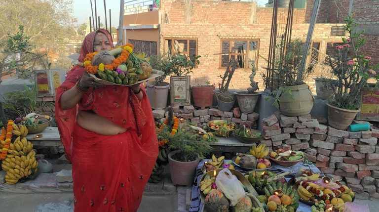 जनकपुरधाम, १८ चैतः छतमै निर्माण गरिएको जलाशयमा उदाउँदो सूर्यलाई अर्घ दिइ छठ पर्व सम्पन्न गर्दै जनकपुरधामका व्रतालु महिला । कोरोना भाइरस सङ्क्रमण नफैलियोस् भनि सरकारले लागू गरेको लकडाउनको पालना गरी यस वर्ष व्रतालुले आ–आफ्नै घरको छतमा जलाशय निर्माण गरी आराधना गरेका छन् । तस्वीरः हिमांशु चौधरी-रासस