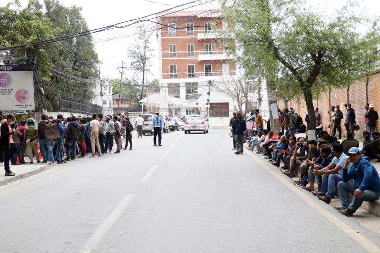 काठमाडौँ, १९ चैत : लकडाउनको समयमा जिल्ला प्रशासन कार्यालय काठमाडौँ, बबरमहलमा विभिन्न ठाउँमा जानका लागि सवारी साधनको पास लिनेको भीड ।