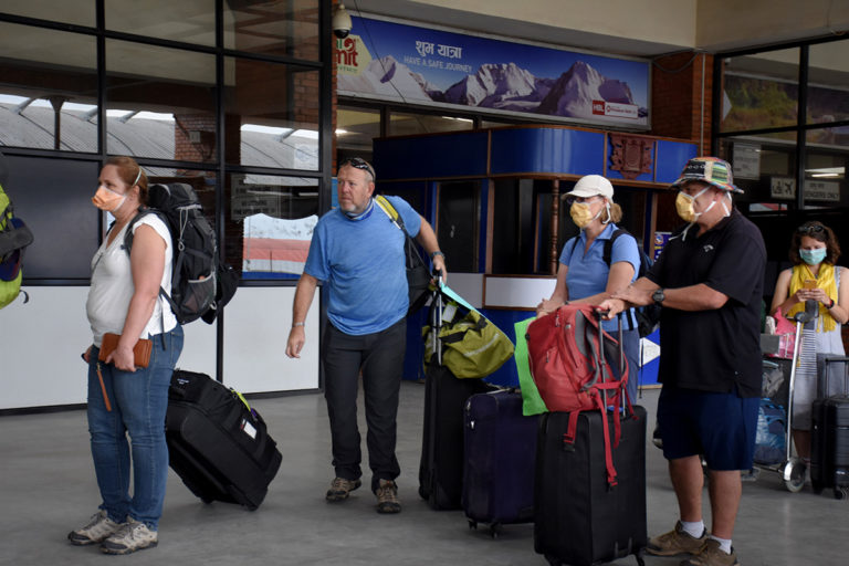 नेपालस्थित् अष्ट्रेलियन दूतावासले आफ्नो दुई सय ६४ जना नागरिकलाई स्वदेश फर्काएको हो । उनीहरुलाई लिएर नेपाल एयरलाइन्सको विमान अष्ट्रेलिया उडेको छ । स्वदेश फर्किन पाउँदा अष्ट्रेलियाली नागरिक खुशी देखिन्थे । कोरोना भाइरस स‌ंक्रमणप्रति सचेत उनीहरु विमानस्थलमा मास्क लगाएर उपस्थित थिए । तस्विर : मुकुन्द कालिकोटे, रिपोर्टर्स नेपाल डटकम
