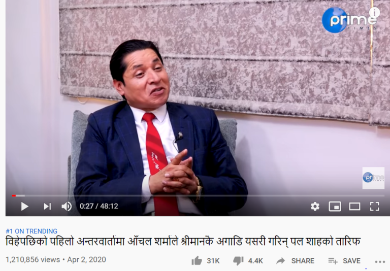 काठमाडौं, २४ चैत्र । पत्रकार ऋषि धमलाले नवविवाहित दम्पत्ति आँचल शर्मा र डा. उदिप श्रेष्ठसँग लिएको अन्तर्वार्ता युट्युबको ट्रेण्डिङ्ग नम्बर एकमा आएको छ । एप्रिल २ तारिखमा प्राईम टाईम्स टेलिभिजनको आधिकारिक युट्युब च्यानलमा प्रशारित उक्त अन्तर्वार्ता पाँच दिन चार दिनमै ट्रेण्डिङ्ग नम्बर वानमा पर्न सफल भएको हो ।