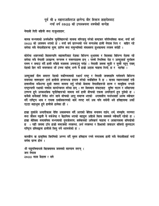 ‘विद्यमान संकटबाट मुक्ति पाउन र भविष्यमा हुने अस्वाभाविक चुनौतीहरुको सामना गर्न हामी बीचको एकता अनिवार्य हुन पुगेको छ,’ नयाँ वर्ष २०७७ को पूर्व सन्ध्यामा पूर्व राजा ज्ञानेन्द्र शाहले विज्ञप्तिमार्फत् भनेका छन्, ‘कसैले कसैलाई निषेध गरेर जाने सोचको आयु समाप्त भएको धरातलीय यथार्थलाई आत्म स्वीकार गर्दै राष्ट्रिय भाव र एकता प्रबलीकरणको मार्ग स्पष्ट गर्न अब पनि सकेनौं भने इतिहासमा अर्को एउटा महाभूल हुने हामीले ठानेका छौं ।’
