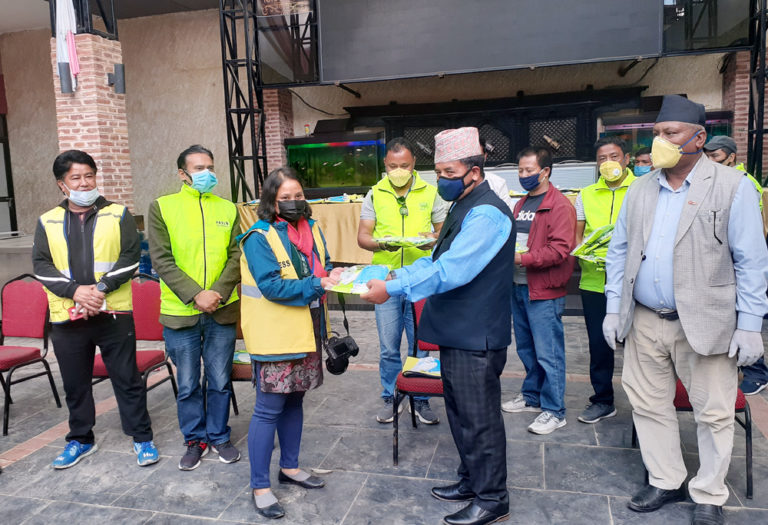 काठमाडौं, ९ बैशाख । सङ्घीय सांसद एवं पूर्वमन्त्री महेश बस्नेतले भक्तपुरका पत्रकारलाई प्रेस ज्याकेट तथा विभिन्न स्वास्थ्य सामग्री वितरण गरेका छन् । मानवीय आस्था नेपालले आज सूर्यविनायकको यो आयोजना गरेको कार्यक्रममा उहाँले ६१ जना पत्रकारलाई प्रेस ज्याकेट, एन ९५ मास्क, सर्जिकल मास्क र सानिटाइजर वितरण गरेका हुन् ।
