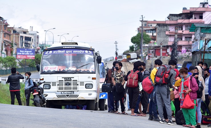 काठमाडौँ, १० वैशाख । बन्दाबन्दीका कारण अत्तालिएका मानिस घर फर्कन कोही दुधे बच्चा काखीमा च्यापेका थिए भने कोही ससाना बालबालिका डो¥याइरहेका थिए । कोही सामान च्यापेर गाडीको प्रतीक्षामा थिए ।