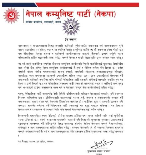 नेपाल कम्युनिष्ट पार्टीले ७१औँ वसन्तमा प्रवेश गरेको अवसरमा आज वक्तव्य जारी गर्दै उनले ऐतिहासिक पार्टी एकतापछि पनि देशीविदेशी प्रतिक्रियावादी शक्तिहरु नेकपालाई कमजोर पार्ने प्रयत्नमा निरन्तर लागिरहेको जनाउँदै पार्टीभित्र खुला र जनवादी छलफल गरी तथ्यद्वारा सत्यको अन्वेषण गर्ने विधिमार्फत पार्टी एकतालाई थप सुदृढ बनाउन आग्रह गरेका हुन्। उनले यही दिशामा सकारात्मक र रचनात्मक योगदानसहित एकताको महत्वलाई बुझ्न र पार्टीलाई अझ सुदृढ गर्दै आ–आफ्नो ठाउँमा सकारात्मक पहल गर्न सम्पूर्ण नेता–कार्यकर्तालाई आह्वान गरेका छन् ।