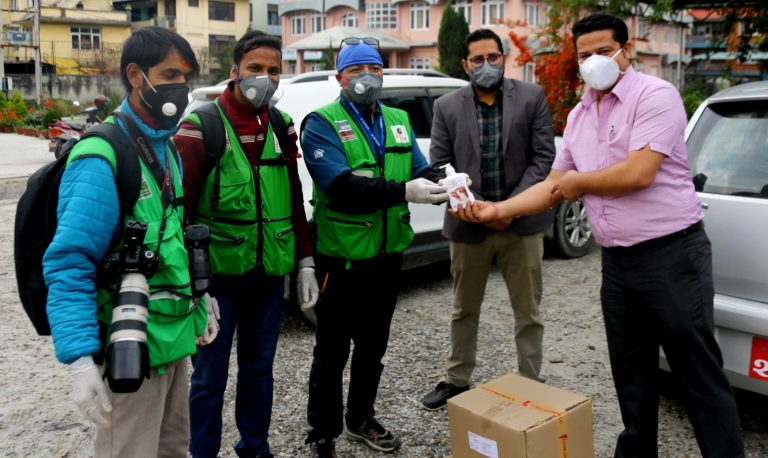 कोरोना संक्रमणविरुद्ध अग्रपंक्तिमा खटिएका फोटोपत्रकारहरु सुरक्षित रहनका लागी आईएमएसका अध्यक्ष दिपक मलहोत्रा, औषधी उत्पादक संघका तर्फबाट महासचिब बिप्लव अधिकारी, देउराली जनता फर्मास्यूटिकल्स प्रा. लि का कार्यकारी निर्देशक हरीभक्त्त शर्मा, पूर्व संचारमन्त्री मोहन बहादुर बस्नेत र नर्भिक अस्पतालका डां. विप्लव सापकोटाले फोटो पत्रकार क्लबलाई स्यानेटाईजर र मास्क उपलब्ध गराउनु भएको छ ।
