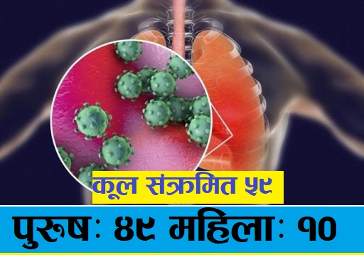 नेपालमा कोरोना भाइरसबाट संक्रमित हुनेको संख्या ५९ पुगेको छ । शुक्रबार रुपन्देहीका २५ वर्षीय र बाँकेका ६० वर्षीय पुरुषमा कोरोना संक्रमण पुष्टि भएको स्वास्थ्य तथा जनसंख्या मन्त्रालयले पुष्टि गरेको हो । दुवैजनाको स्वास्थ्य अवस्था सामान्य रहेको र स्वास्थ्यकर्मीको निगरानीमा रहेको मन्त्रालयका प्रवक्ता डा. देवकोटाले जानकारी दिए ।