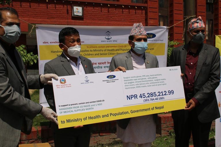 महिला, बालबालिका तथा ज्येष्ठ नागरिकमन्त्री पार्वत गुरुङको समन्वयमा समाज कल्याण परिषदमार्फत् एआइएनले स्वास्थ्य तथा जनसंख्यामन्त्री भानुभक्त ढकाललाई ४ करोड ५२ लाख ८५ हजार भन्दा बढि मूल्यको स्वास्थ्य सामग्री हस्तान्तरण गरेको हो । बुधबार काठमाडौंको रामशाहपथस्थित स्वास्थ्य तथा जनसंख्या मन्त्रालय परिसरमा नेपालस्थित अन्तराष्ट्रिय गैर सरकारी संस्थाहरु आवद्ध सो एशोसिएशनले नेपाल सरकारलाई हस्तान्तरण गरेको सामग्रीहरुमा सर्जिकल मास्क, ह्याण्ड सेनिटाइजर, सर्जिकल स्टिराइल ग्लोभ, डिस्पोजल क्याप, आई गुगल्स, शू कभर, साबनलगायत रहेका छन ।
