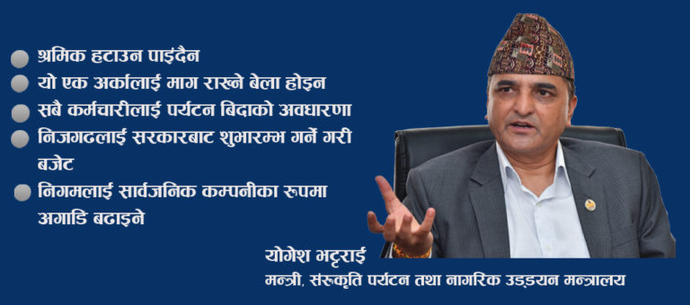 यो अवस्थामा समग्र पर्यटन क्षेत्र संरक्षणका लागि सरकारको रणनीति र तत्कालीन समस्या समाधानका लागि भइरहेका प्रयासका बारेमा संस्कृति, पर्यटन तथा नागरिक उड्डयनमन्त्री योगेश भट्टराईसँग गोरखापत्रका अच्युत अधिकारी र विश्वास रेग्मीले गर्नुभएको कुराकानी : कोभिड–१९ का कारण नेपालको पर्यटन र उड्डयन क्षेत्र सम्भवतः अहिलेसम्मकै कठिन परिस्थितिबाट गुज्रिएको छ । यस क्षेत्रले पछिल्लोपटक बेहोरेकोे क्षतिको पूर्वानुमान मन्त्रालयले कसरी गरेको छ ?