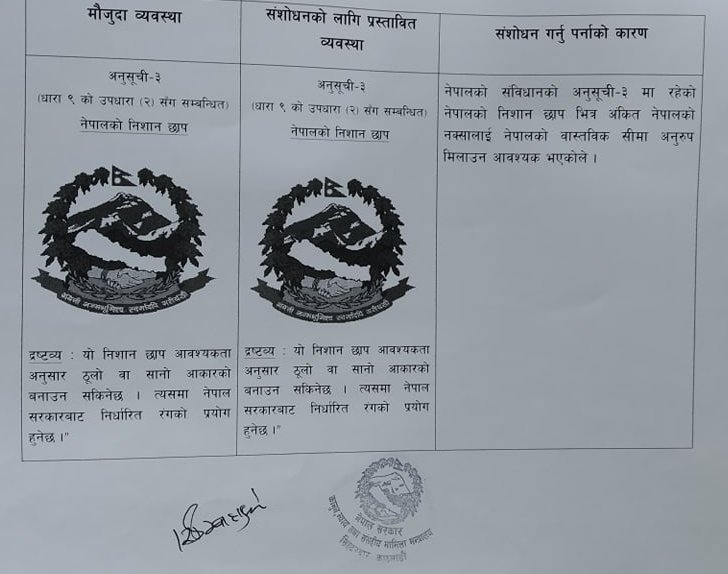 काठमाडौं, ९ जेठ। कानून, न्याय तथा संसदमीय मामिलामन्त्री डा. शिवमाया तुम्बाहाङफेले संशोधन विधेयक संसदमा दर्ता गरेकी छन् । मन्त्रिपरिषद् बैठकको आजको बैठकले नेपालको नयाँ नक्शा र निशान छाप समेटिने गरी संविधान संशोधनसम्बन्धी विधेयक ल्याउने निर्णय गरेको थियो । सोहीअनुसार मन्त्रिपरिषद्को निर्णयअनुसार तुम्बाहाङफेले विद्येयक दर्ता गरेकी हुन् ।