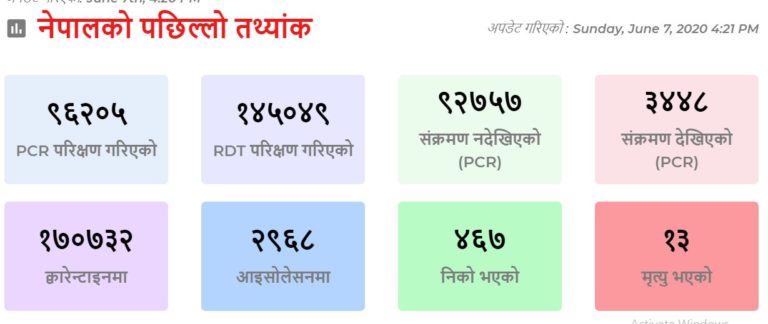 जेठ २५, काठमाण्डौ । नेपालमा अहिलेसम्म कूल २ लाख ४१ हजार २ सय ५४ जनाको कोरोना भाइरस परीक्षण गरिएको छ । हालसम्म हालसम्म ९६ हजार २ सय ५ जनाको पिसीआर परीक्षण र १ लाख ४५ हजार ४९ को आरडीटी टेस्ट सम्पन्न भएको स्वास्थ्य तथा जनसंख्या मन्त्रालयका प्रवक्ता डा. विकास देवकोटाले जानकारी दिए । पछिल्लो २४ घण्टामा ३ हजार ७ सय २८ वटा पिसिआर परिक्षण भएको छ भने आरडिटी विधिबाट ७ हजार ६ सय १४ वटा परिक्षण भएको छ । दुवै विधि गरेर पछिल्लो २४ घण्टामा ११ हजार ३ सय ४२ वटा परीक्षण भएको छ ।