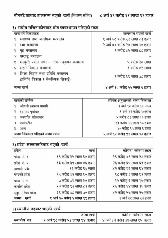 काठमाडौं, ३१ जेठ । सरकारले कोरोना रोकथाम र उपचारमा भएको खर्च सार्वजनिक गरेको छ । प्रधानमन्त्रीका प्रेस सल्लाहकार सूर्य थापाले सामाजिक सञ्जाल ट्विटरमार्फत सिसिएमसी निर्देशक समितिले सार्वजनिक गरेको खर्च विवरण सार्वजनिक गरेका छन् ।