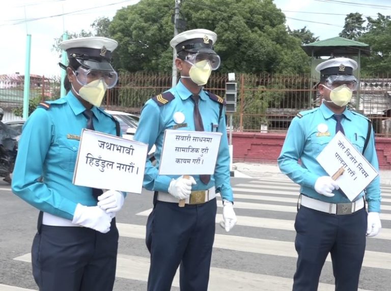 असार १, काठमाण्डौ । पछिल्ला दिनमा सडकमा छेउछाउमा ट्राफिक प्रहरीहरु जनतालाई माक्स लगाउन आग्रह गरिएको प्लेकार्ड लिएर उभिइरहेको देखिन्छ । अनि सामाजिक दुरी कायम गर्नेदेखि मोटरसाइकलमा एकजना यात्रा गर्नुहोला भनेर लेखेको कागज बोकेर उनीहरु घण्टौँसम्म सडक छेउमा उभिएको पाइन्छ ।