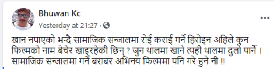 यसअघि साम्राज्ञीले चलचित्र क्षेत्रमा ठुला भन्नेले गलत व्यवहार गरेको भन्दै भिडियो सार्वजनिक गरेकी थिइन् । त्यसपछि भुवनले खान नपाएको भन्दै सामाजिक सञ्जालमा रोई कराई गर्ने हिरोइन अहिले कुन फिल्मको नाम बेचेर खाइरहेकी छिन् ? भनी प्रश्न गरेका थिए । उनले साम्राज्ञीप्रति व्यंग्य गर्दै यस्तो लेखेका थिए । उनले अगाडि लेखेका छन्, जुन थालमा खाने त्यही थालमा दुलो पार्ने ।