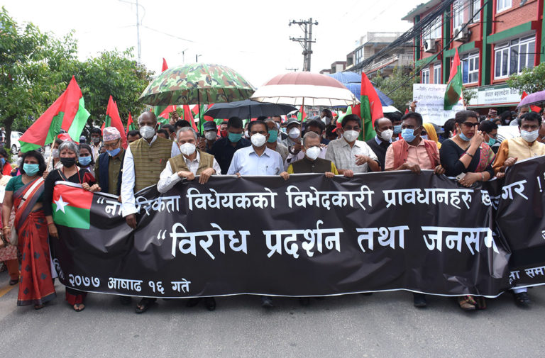 काठमाडौं, १६ असार । जनता समाजवादी पार्टी, नेपालले नागरिकता विद्येयकको विरोधमा आज प्रदर्शन गरेका छन् । संसदीय समितिबाट पारित नेपालको नागरिकता (पहिलो संशोधन) ऐन २०७७ फिर्ता लिन माग गर्दै जसपाका शीर्ष नेताहरु आज माईतीघर मण्डलामा उपस्थित् भएर प्रदर्शन गरेका हुन् । नागरिकता विधेयकमा अंगीकृत नागरिकता प्राप्त गर्न सात वर्ष पर्खनुपर्ने प्रावधानविरुद्ध जसपा आन्दोलनमा उत्रिएको नेता केशब झाले रिपोर्टर्स नेपाल डटकमलाई जानकारी दिए । तस्विर : मुकुन्द कालिकोटे, रिपोर्टर्स नेपाल डटकम