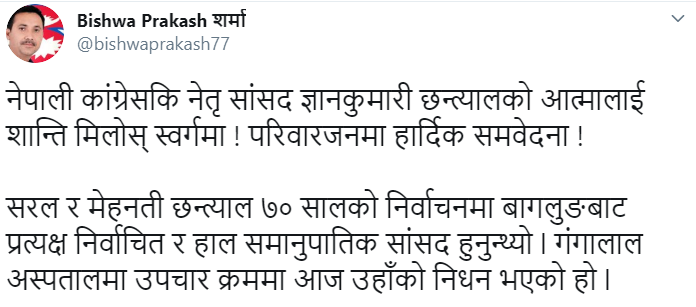 काठमाडौं, १७ असार । प्रमुख प्रतिपक्षी दल नेपाली कांग्रेसकी प्रतिनिधिसभा सदस्य ज्ञानकुमारी छन्त्यालको निधन भएको छ । उनको आज विहान गंगालाल राष्ट्रिय हृदयरोग केन्द्र काठमाडौंमा उपचारको क्रममा निधन भएको कांग्रेस प्रवक्ता विश्वप्रकाश शर्माले जनाएका छन् ।
