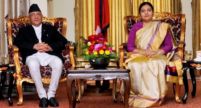 काठमाडौं, १८ असार । प्रधानमन्त्री केपी शर्मा ओलीले राष्ट्रपति विद्यादेवी भण्डारीलाई शितवनिवासमा भेटी पछिल्लो राजनीतिक घटनाक्रमबारे छलफल गरेका छन् । ओलीले भण्डारीले राजनीतिक परिस्थित र सम्भावनाबारे ब्रिफिङ गरेका छन् । राष्ट्रपतिका स्वकीय सचिव भेषराज अधिकारीले राष्ट्रपति र प्रधानमन्त्रीबीच पछिल्लो राजनीतिक अवस्थाबारे छलफल भएको जानकारी दिए ।