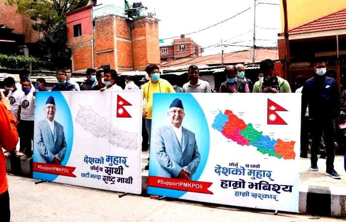 उनीहरुले ‘आज होइन भोलिलाई, हाम्रो समर्थन ओलीलाई’, ‘वैदेशिक हस्तक्षेप चाहिँदैन, सरकार ढाल्न पाइँदैन’ लगायतका नारा लगाएको हाम्रो सहकर्मी मुकुन्द कालिकोटेले जानकारी दिए । तस्विर : मुकुन्द कालिकोटे, रिपोर्टर्स नेपाल डटकम
