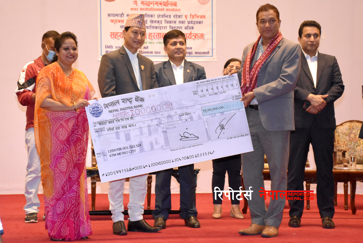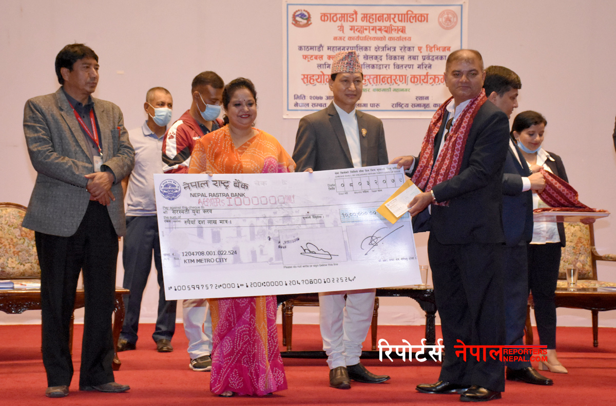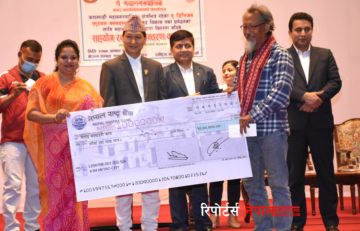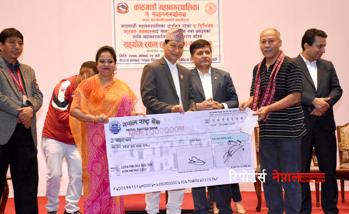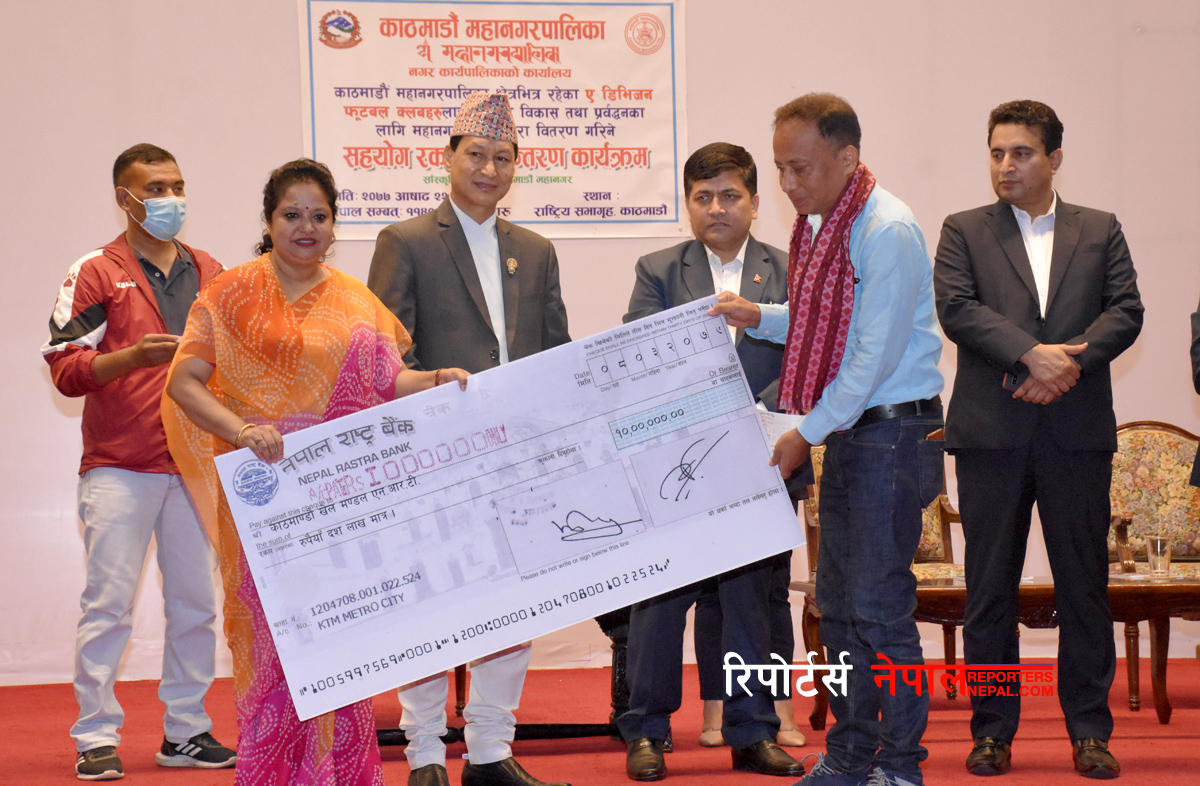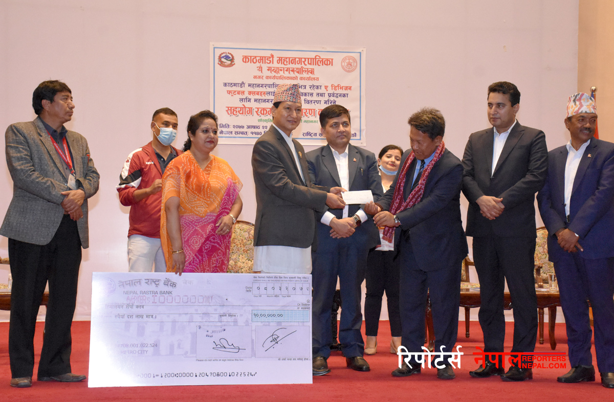 काठमाडौं, २२ असार । काठमाडौं महानगरपालिकाले विभिन्न ६ वटा ‘ए’ डिभिजन फुटबल क्लबलाई जनही १० लाख रुपैयाँ अनुदान प्रदान गरेको छ । आज राष्ट्रिय सभागृहमा आयोजित एक कार्यक्रमका बीच महानगरले उक्त रकम प्रदान गरेको हो । महानगरका मेयर विद्यासुन्दर शाक्य र उपमेयर हरिप्रभा खड्गीले ६ वटा क्लबका अध्यक्षहरुलाई अनुदान रकमको चेक हस्तान्तरण गरेका हुन् ।