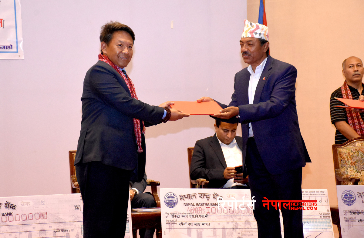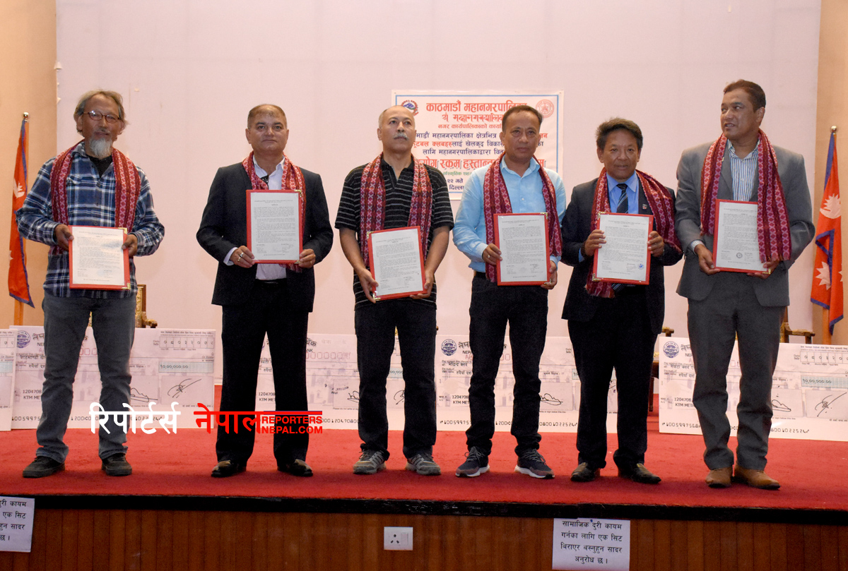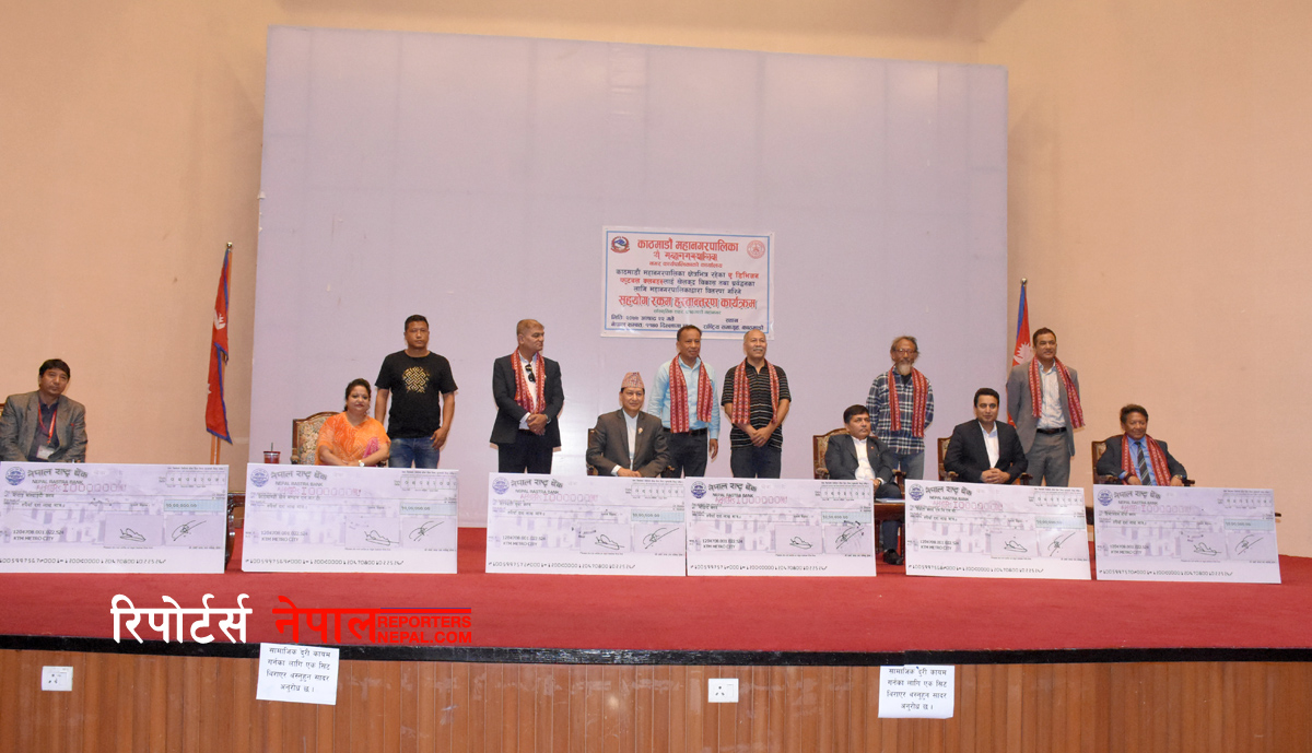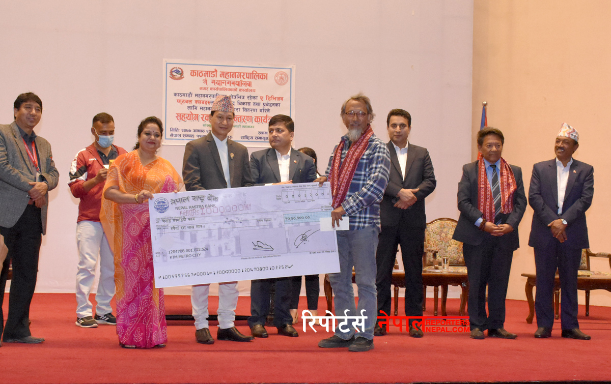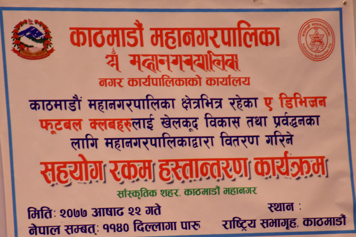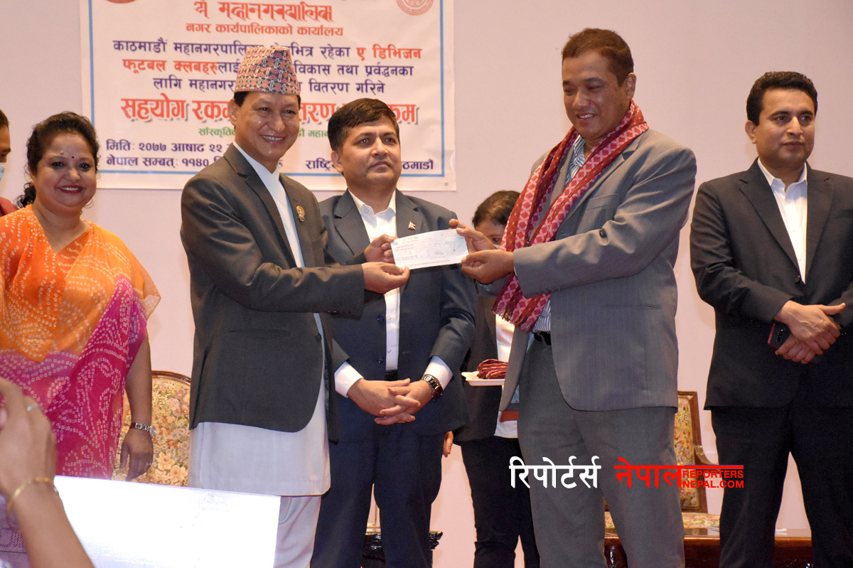 काठमाडौं, २२ असार । काठमाडौं महानगरपालिकाले विभिन्न ६ वटा ‘ए’ डिभिजन फुटबल क्लबलाई जनही १० लाख रुपैयाँ अनुदान प्रदान गरेको छ । आज राष्ट्रिय सभागृहमा आयोजित एक कार्यक्रमका बीच महानगरले उक्त रकम प्रदान गरेको हो । महानगरका मेयर विद्यासुन्दर शाक्य र उपमेयर हरिप्रभा खड्गीले ६ वटा क्लबका अध्यक्षहरुलाई अनुदान रकमको चेक हस्तान्तरण गरेका हुन् ।