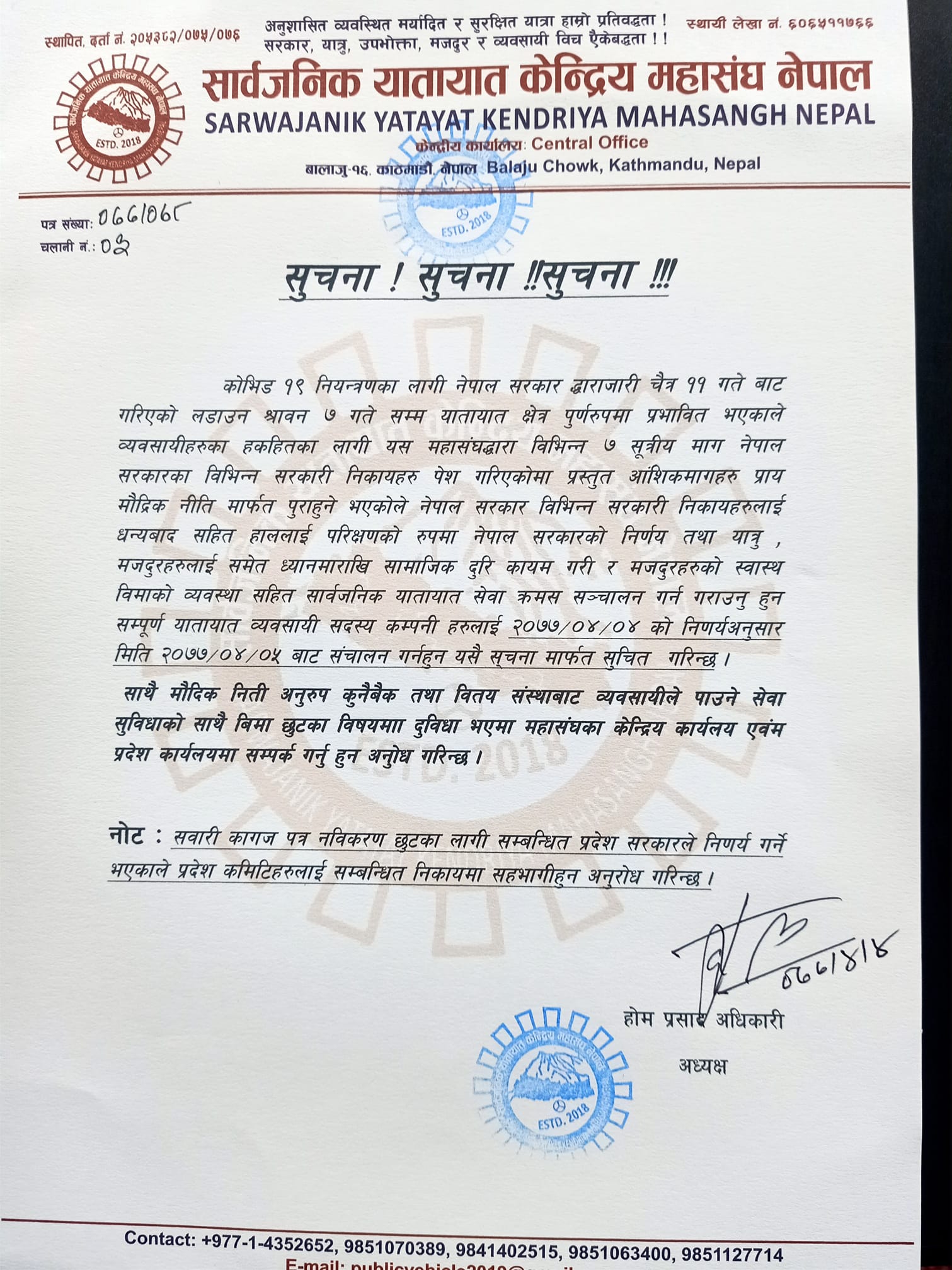 महासंघका अध्यक्ष होमनाथ अधिकारीले महासंघका विभिन्न ७ सूत्रीय मागमध्ये आशिंक रुपमा नेपाल राष्ट्र बैंकले जारी गरेको मौद्रिक नीतिमार्फत् पुरा हुने भएकाले यातायात सुचारु गर्न भनेका हुन् । उनले यात्रु मजदुरहरुलाई समेत ध्यानमा राखी सामाजिक दुरि कायम गरी मजदुरहरुको स्वास्थ्य बिमाको व्यवस्था सहित ५ साउनबाट यातायात संचालन गर्न सुचना जारी गरेका हुन् ।