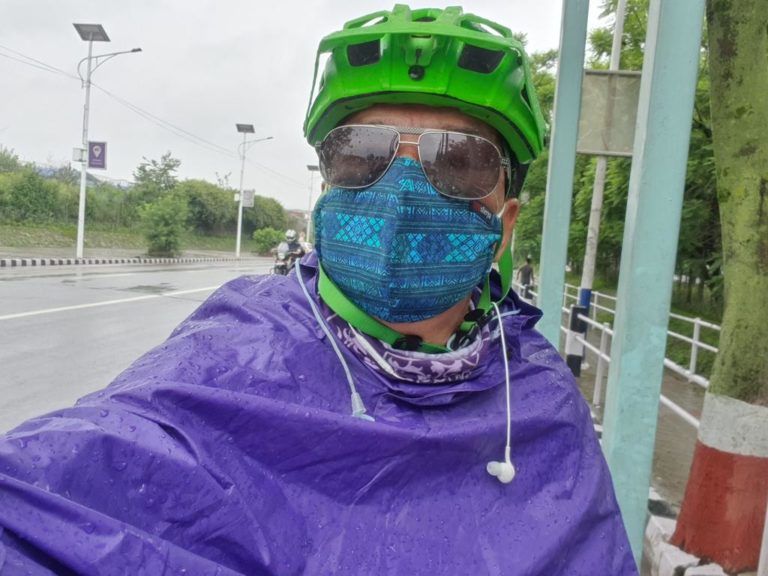 काठमाडौ, साउन ५ । आखाँमा ठूलो चस्मा, टाउँकामा हेल्मेट, मुख छोप्नेगरि लगाइएको मास्क अनि घाटीमा गित सुन्ने एयरफोन । यो कुनै साईकल दौडमा सहभागी खेलाडी वा कुनै विदेशी? । धेरैलाई जिज्ञासा हुनु स्वभाविकै हो । भारी बर्षाका बिच रेनकोट ओढेर हाप पाइन्टमा साइकल कुदाउँदै निस्केका सेलिब्रेटि जस्तै देखिने को होलान ?
