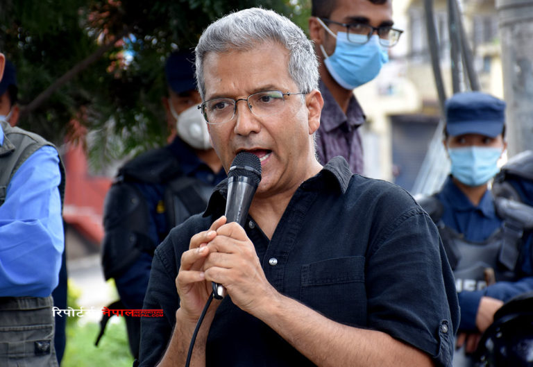 संयोजक मिश्रले प्रधानन्यायाधीश जबरालाई भने,‘तपाई पहिले पनि विवादित हुनुहुन्थ्यो, हत्यारा रञ्जन कोईरालालाई सफाई दिएर देश र न्यायालयको बेईजत गर्नुभयो, तपाई यति विवादित हुनुभयो कि सम्झँदा मुटु काँप्छ र पोल्छ । त्यसकारण सर्वोच्च अदालतको ईज्जत र प्रतिष्ठाको लागि पनि तपाईले राजीनामा दिनुस् ।’ तस्वीर : मुकुन्द कालिकोटे, रिपोर्टर्स नेपाल डटकम