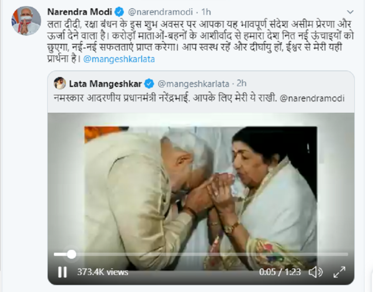 नरेन्द्र भाइ आज राखीको शुभ अवसरमा म तपाईंलाई प्रणाम गर्छु, लताले भनिन्, ‘राखीको दिन हामीलाई बचन दिनुहोस् कि तपाई भारतलाई योभन्दा उचाईमा लिएर जानुहुनेछ ।’ उनले मोदीले भारतका लागि धेरै राम्रो काम गरेको र धेरै राम्रो कुरा पनि गरेको बताइन् । मोदीको काम कहिले भुल्न नसकिने खालको भएको उनको भनाई थियो ।