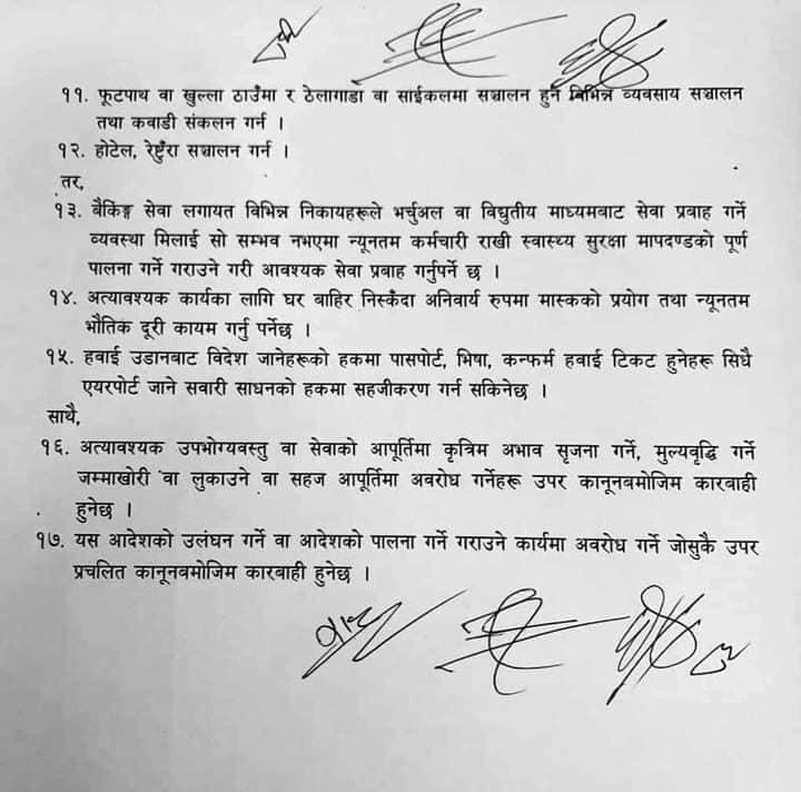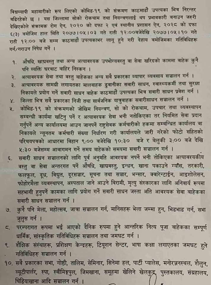 बुधबार मध्यरातिदेखि भदौ १० गतेसम्म निषेधाज्ञा घोषणा गरिएको हो । अत्यावश्यबाहेक सबै सेवा बन्द हुने बताइएको छ ।