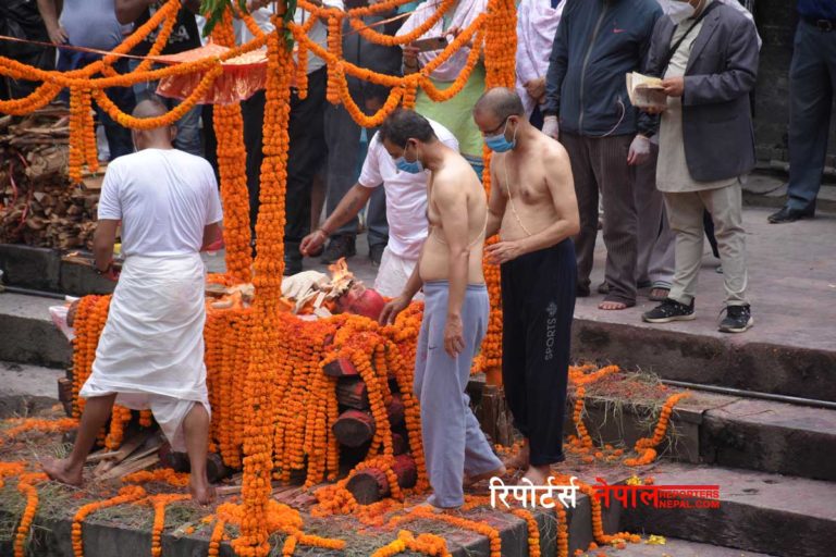 काठमाडौं, ३ भदौ । दिवङ्गत राष्ट्रकवि माधवप्रसाद घिमिरेको आज पशुपति आर्यघाटमा राष्ट्रिय सम्मानसहित अन्त्येष्टि गरिएको छ । उनको पार्थिव शरीरमा छोराहरु इन्दिवर र राजीव घिमिरेले मुखाग्नि अर्पण गरेका थिए । यसअघि उनको निवास लैनचौर, अलकापुरी पुगी दिवङ्गत घिमिरेप्रति उपप्रधानमन्त्री ईश्वर पोखरेल, नेपाली काँग्रेसका सभापति शेरबहादुर देउवा, वरिष्ठ नेता रामचन्द्र पौडेल, महामन्त्री डा शशांक कोइराला, नेता अर्जुननरसिंह केसी, नेपाल प्रज्ञा–प्रतिष्ठानका कुलपति गङ्गाप्रसाद उप्रेतीलगायतले श्रद्धाञ्जलि व्यक्त गरेका थिए ।